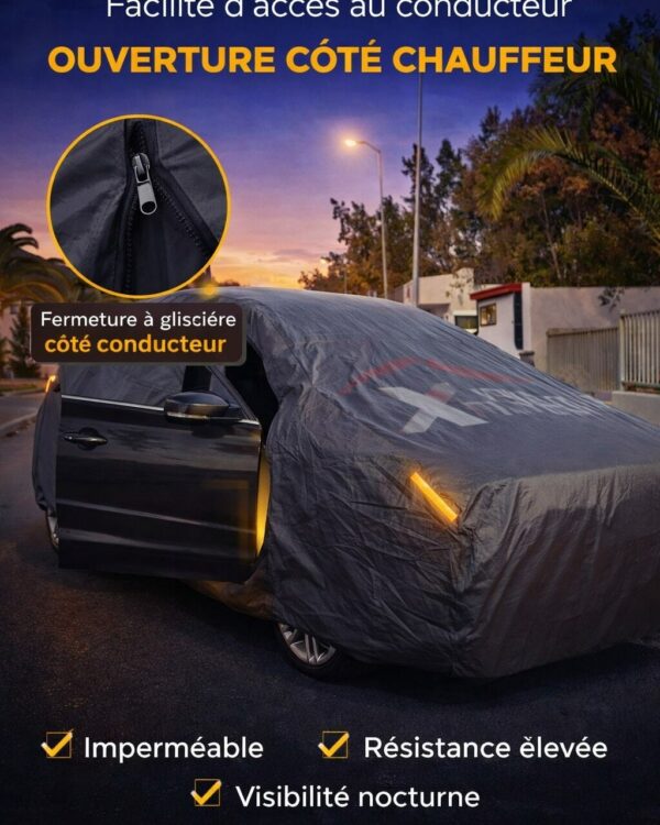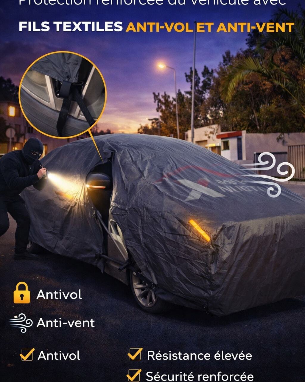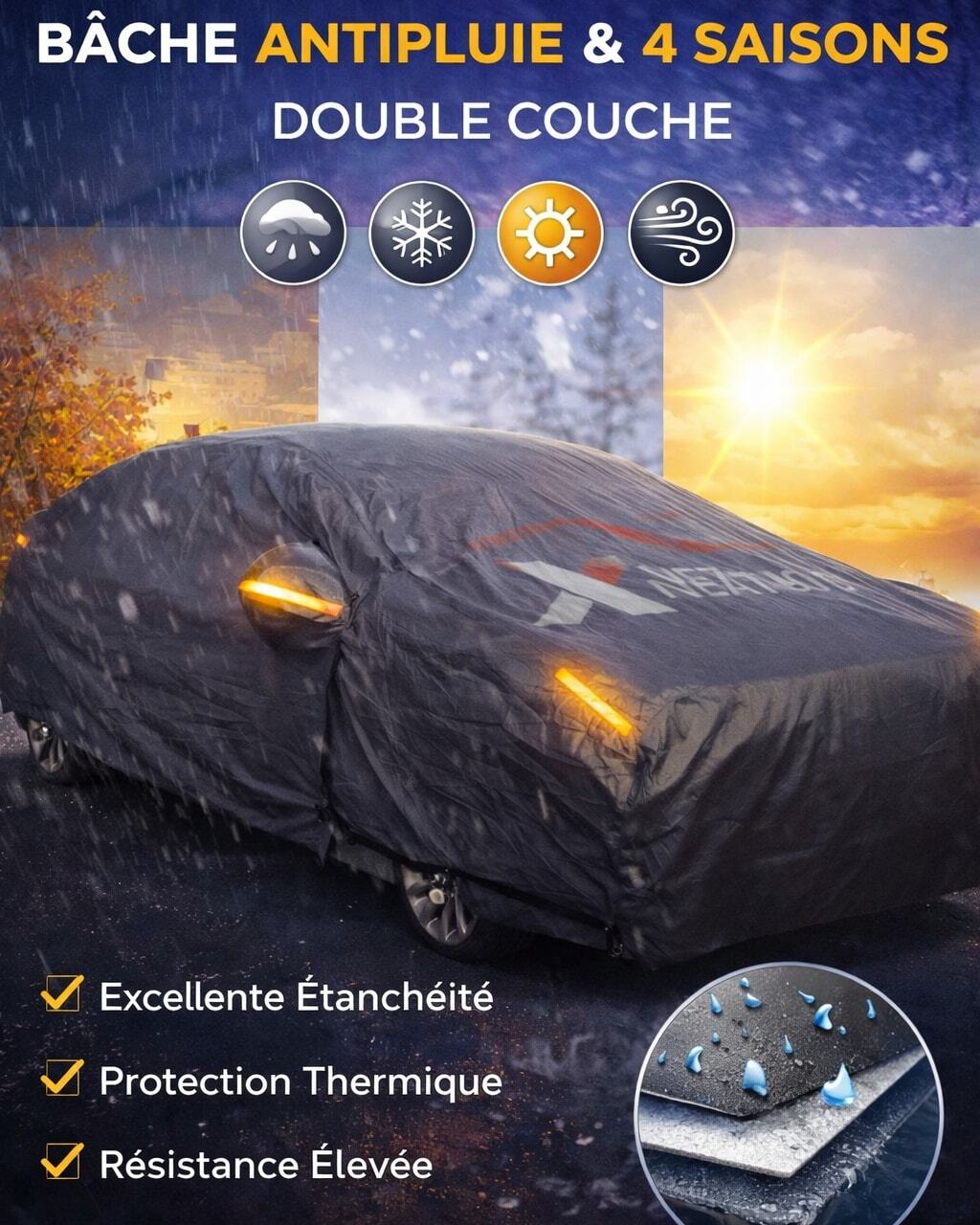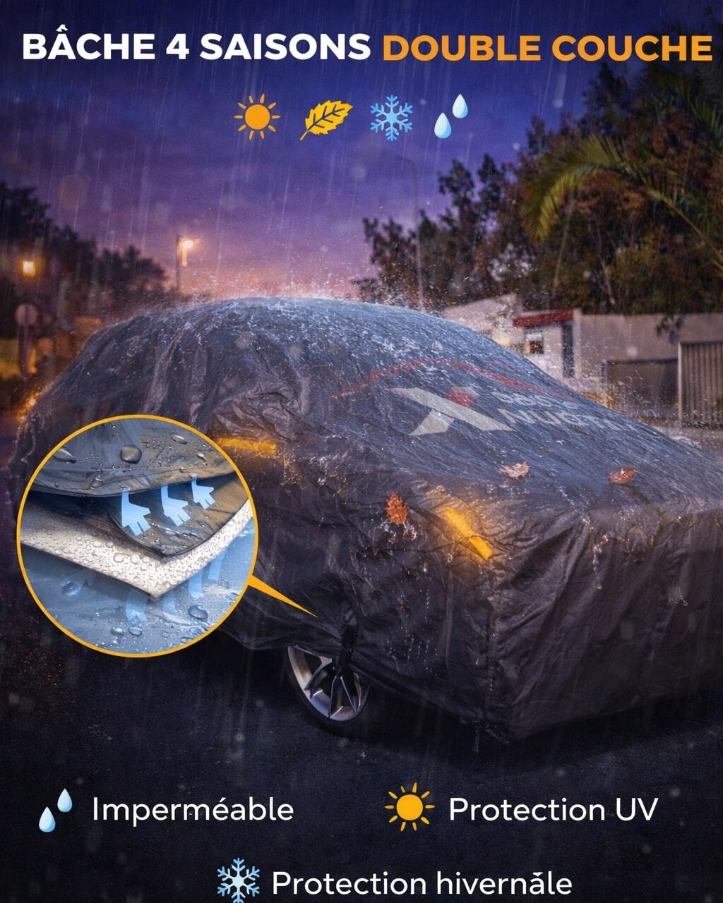 Cette bâche de protection pour voiture est conçue pour offrir une protection complète 4 saisons contre la pluie, le soleil, la poussière, le vent et le froid. Grâce à sa double couche renforcée, elle assure une excellente étanchéité et une protection thermique optimale, tout en préservant la carrosserie de votre véhicule.