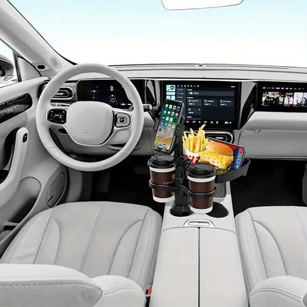 Il s’installe facilement dans le porte-gobelet d’origine et permet de maintenir le téléphone, une boisson et un plateau d’appoint, sans gêner la conduite.